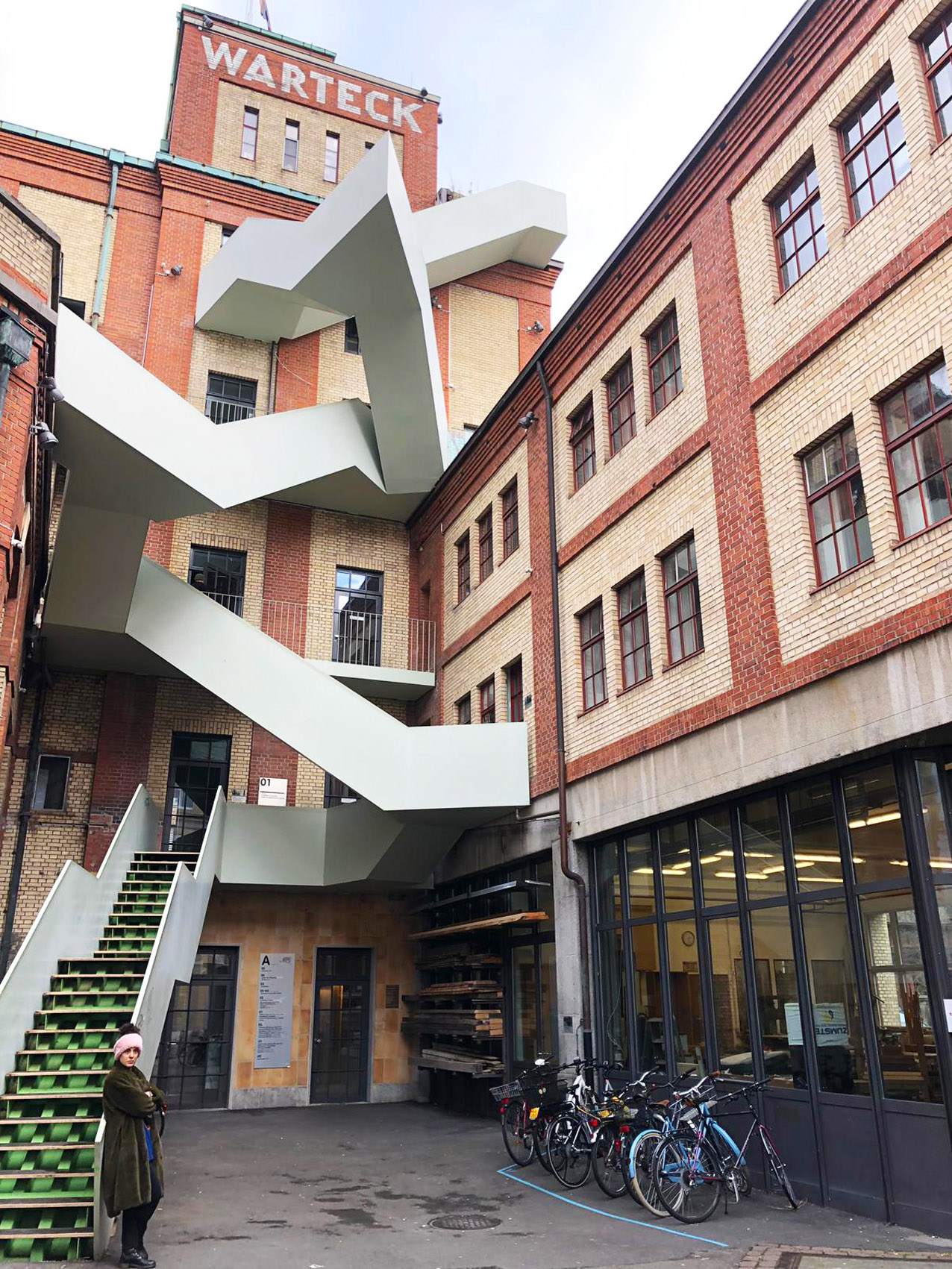 Nella piccola Basilea io volevo assolutamente visitare il Werkraum Harteck PP, a un chilometro dal centro storico. Siamo arrivati qui da una strada laterale. Cercavamo la facciata con le scalinate (per me il luogo più instagrammabile delle città). Dopo aver girato tre dei quattro lati della struttura, preoccupata di non trovarla, siamo entrati da una porta aperta e ci siamo avventurati per i piani fantasma della struttura, il 2 gennaio era tutto chiuso per le feste. Ci siamo così ritrovati all’ultimo piano e solo lì abbiamo capito che quelle scale erano proprio sull’ultimo lato. Dal rooftop si gode di un panorama mozzafiato sul Reno e su Basilea. Certo per mio fratello che soffre di vertigini, fare quelle scale in discesa non è stato così divertente. Questo posto è pazzesco: un ex-birrificio ora sede di svariati atelier, uffici di design, bar/cantine.