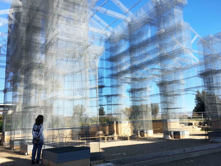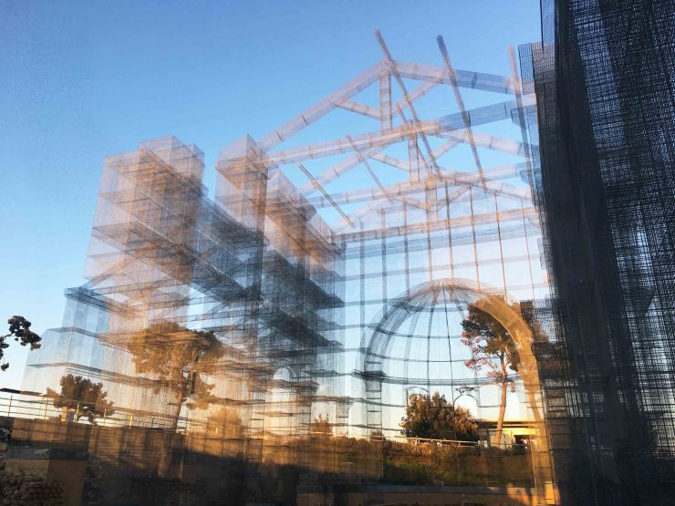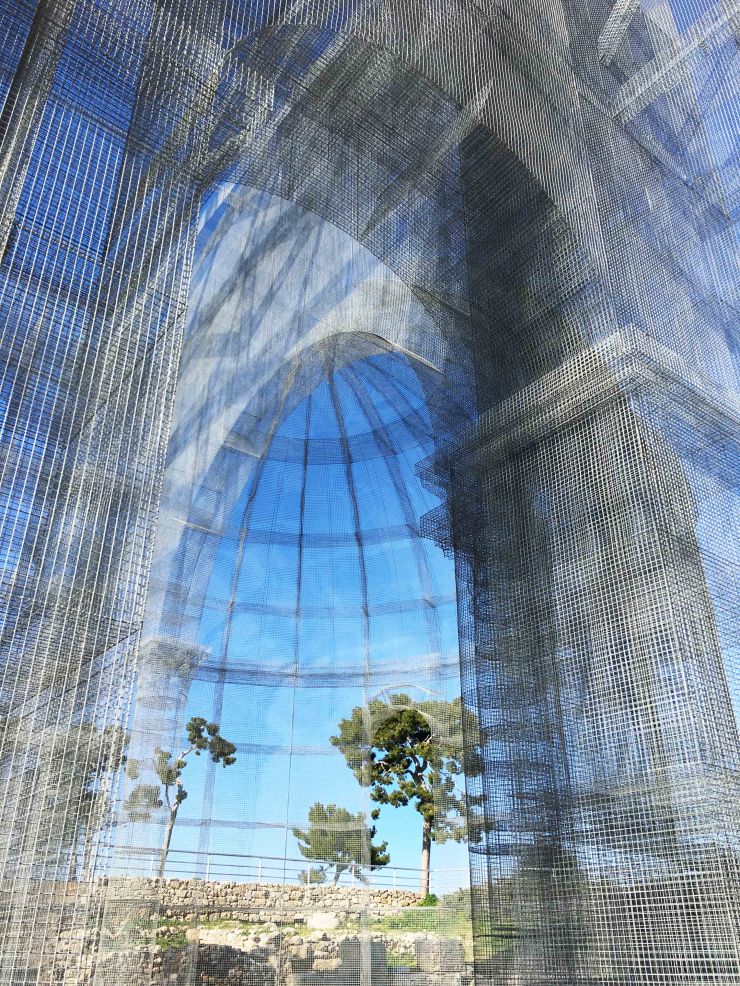 Una struttura trasparente, leggere, apparentemente fragile, tridimensionale, in movimento. Un nuovo tipo di restauro archeologico che segna un nuovo sodalizio tra arte e spazio/paesaggio in cui sorge.