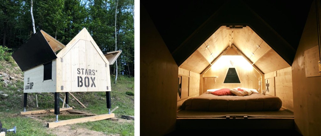 La Stars box invece è una scatola di sogni in legno, all’Agriturismo Ca’ di Voi. Questa struttura si ispira ai giacigli temporanei dei pastori delle Alpi Liguri e utilizza materiali naturali per una fruizione consapevole dei luoghi in cui sorge con in più una nota magica, si apre la cielo, con un suggerimento-auspicio ben preciso: “Look UP”!