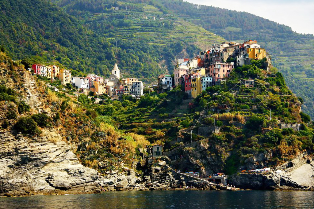 Inaccessibile o quasi dal mare, Corniglia si erge su una scogliera alta cento metri, attorniata da vigneti.