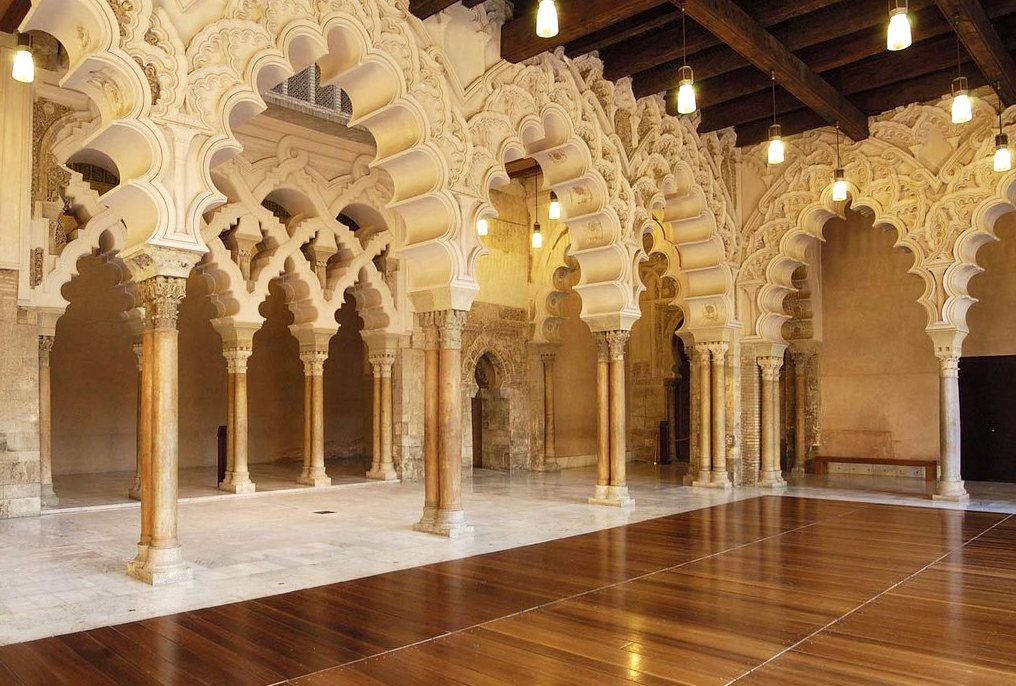 Ed ora lasciamoci trasportare in un altro mondo, quello orientale e sognante del Palacio de la Aljafería. Attuale sede della Cortes di Aragona, il parlamento regionale, è uno dei più importanti monumenti dell’architettura ispano-musulmana del XI secolo. Sorgeva inizialmente fuori dalle mura romane ed è stato successivamente inglobato in città con l’espansione urbana. Nel tempo ha subito diversi rifacimenti che lo hanno visto prima sede di un monastero benedettino e poi della residenza dei re d’Aragona. L’esterno austero è in netta contrapposizione con la ricchezza degli interni, riflesso dello splendore raggiunto dal regno di taifa di Saragozza: ci basterà passeggiare nel giardino e tra i portici del Patio de Santa Isabel, nelle sale in stile “mudéjar” con gli intarsi sul legno e alzare lo sguardo al soffitto a rosoni della Sala del Trono per ammirarne la bellezza. 【Piccola curiosità】
