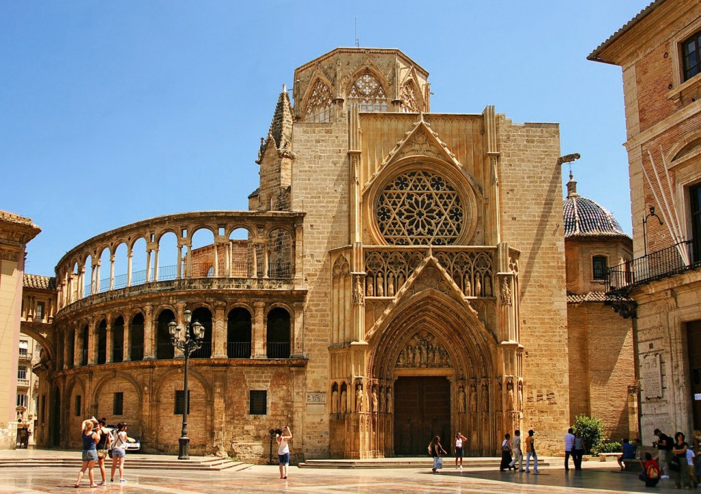 Passando per il Palau de la Generalitat, formato da due torrioni laterali ed un corpo centrale più basso in stile gotico che sembra unirle, arriveremo alla Catedral Santa Maria de Valencia. Edificata nel XIII secolo, lì dove sorgeva prima un tempio romano, poi una moschea musulmana, è un intreccio di stili: la porta principale detta “de los Hierros”, con figure femminili a busto scoperto, è barocca; il Portale del Palazzo è romanico, mentre il Portale degli Apostoli che dà accesso al Miguelete è gotico. Questo campanile, noto come Torre del Miguelete, attraverso una scala a chiocciola di 207 gradini, ci farà accedere, da una altezza di circa cinquanta metri, ad una delle viste panoramiche più belle di Valencia, occhio per chi soffre di vertigini! Dicono che nelle giornate particolarmente limpide, si possa scorgere il profilo di Ibiza. La Cattedrale si trova tra Plaza de la Reina e Plaza del Virgen. Oltre le tele del Goya custodisce, nella Cappella Santo Caliz, il Santo Graal, il calice da cui Gesù bevve durante l’ultima cena.