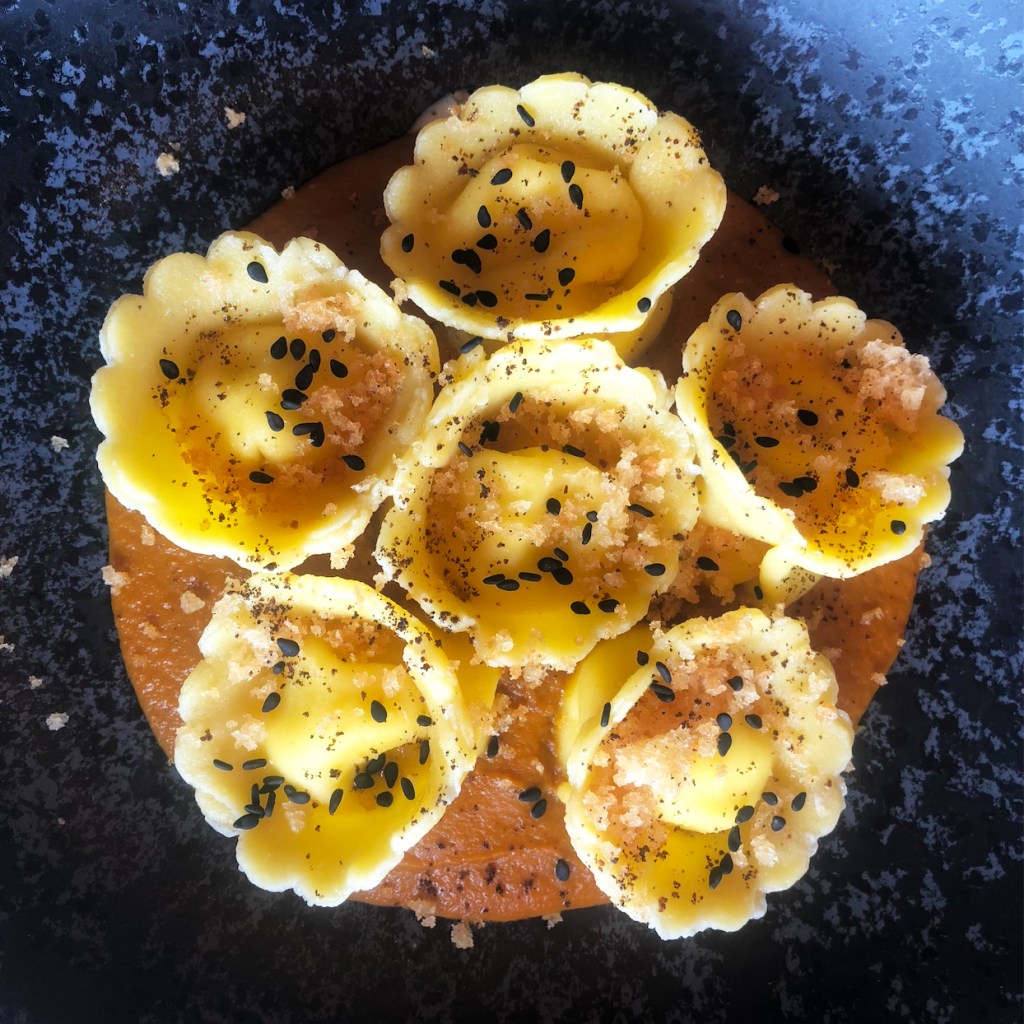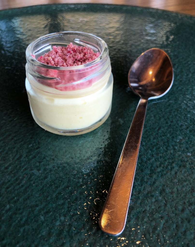 Io ho scelto un menù vegetariano: La Ripiena, cappelletto ripieno di stracchino, crema di carote arrosto, pane fritto, sesamo nero; Melanzana alla Parmigiana “Evoluta”; predessert di crema al limone con crumble al lampone; Millefoglie con ganache montata al cioccolato bianco, caramello salato e mandorle.