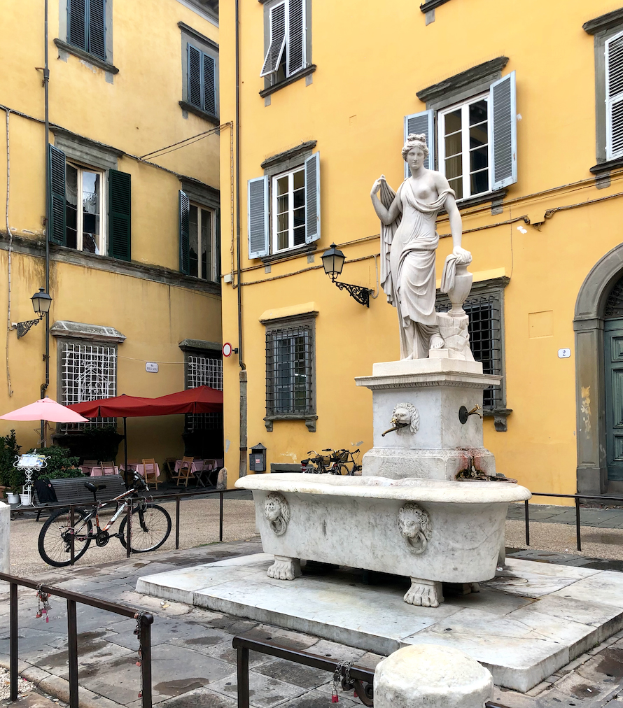 Così chiamata dai lucchesi, si trova in Piazza San Salvatore. In marmo, è costituita da un piedistallo con la statua di una Naiade che poggia su un’anfora e da una vasca con teste di leone. A causa del seno parzialmente scoperto, ne fu inutilmente (per fortuna direi) richiesta la rimozione per offesa al pubblico pudore.