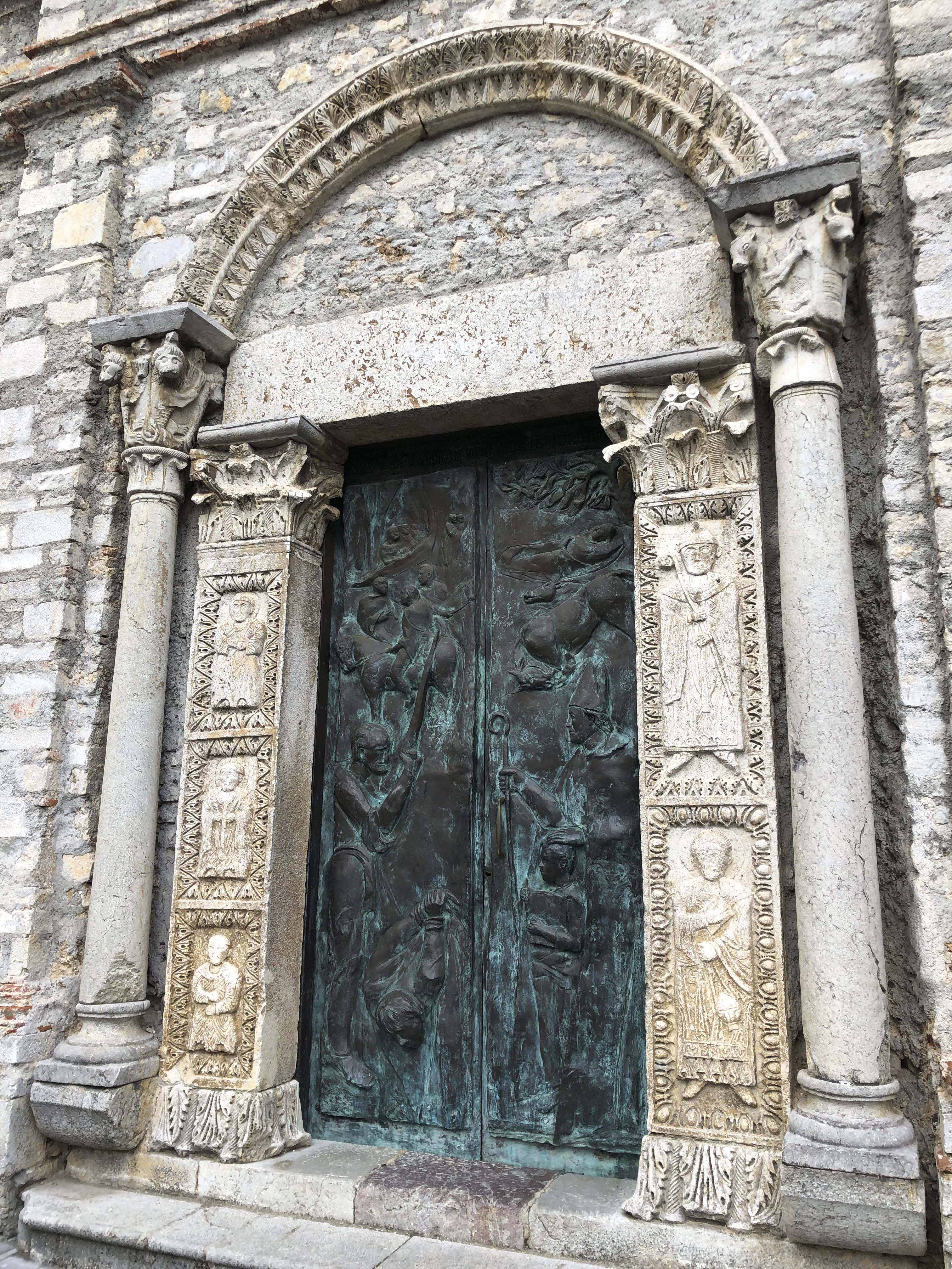 Il portale in pietra del 1200 è di Melchiorre da Montalbano ed è sorretto da colonne in stile corinzio.
