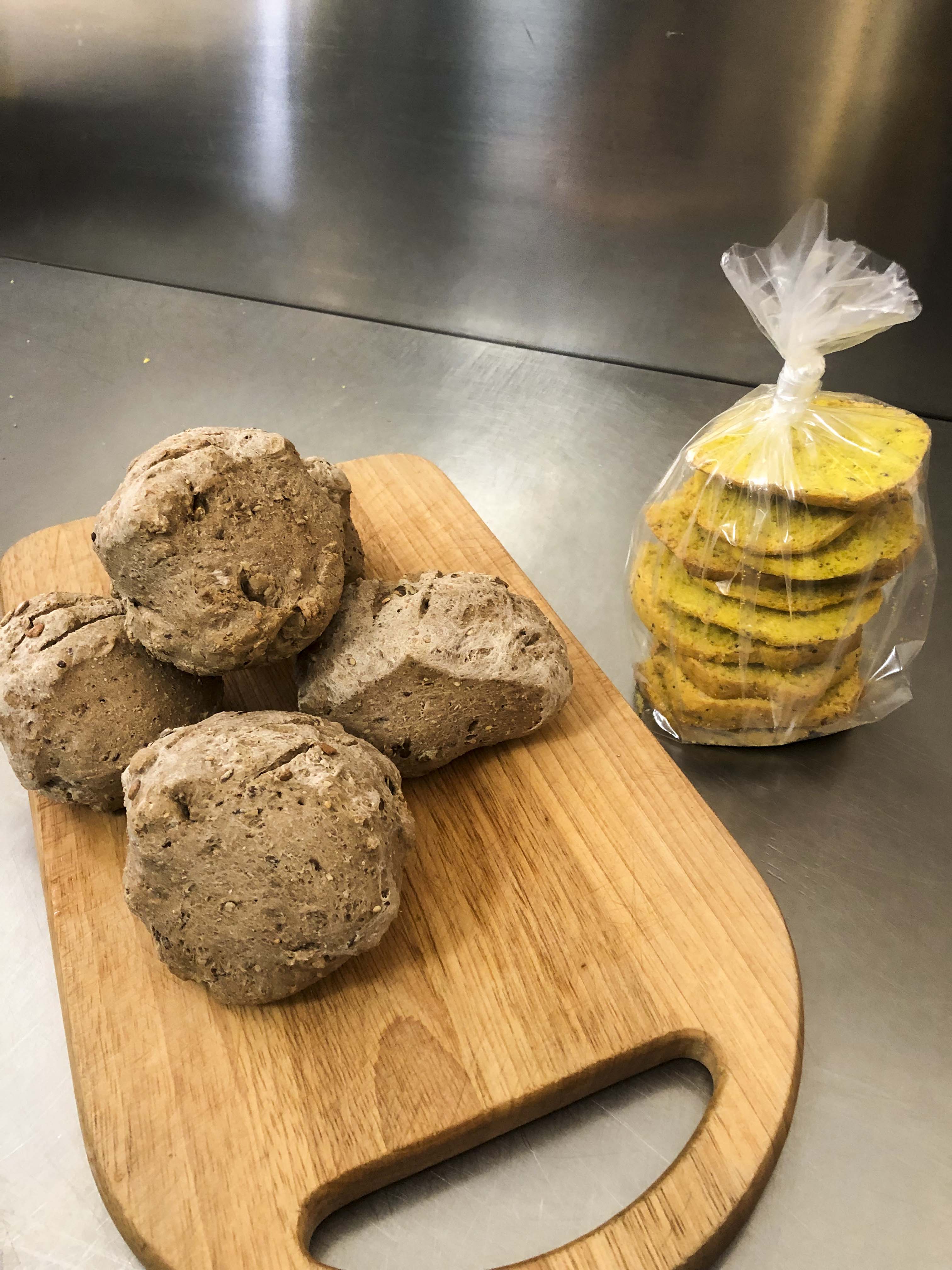 Munita di copricapo e copriscarpe monouso, sono entrata nel laboratorio per assistere alla preparazione dei taralli tradizionali e osservare l’incredibile manualità degli artigiani: taralli morbidi e taralli classici al finocchietto selvatico dei monti lucani; grissini alla curcuma e integrali ai multicereali arricchiti con semi di soia, lino, girasole e laim (ne ho fatto scorta); biscotti e infine il pane, cotto due volte per diventare poi frisella.