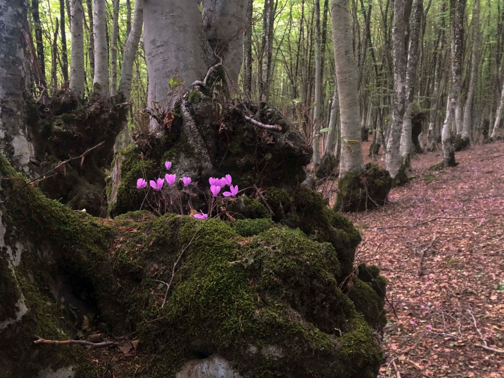 Ed è così allora che il tronco si ricopre di muschio, licheni e ciclamini. Si, quelli che vedi sono proprio dei ciclamini che riescono a fiorire, nonostante la poca luce, in una strana quanto perfetta convivenza con i faggi.