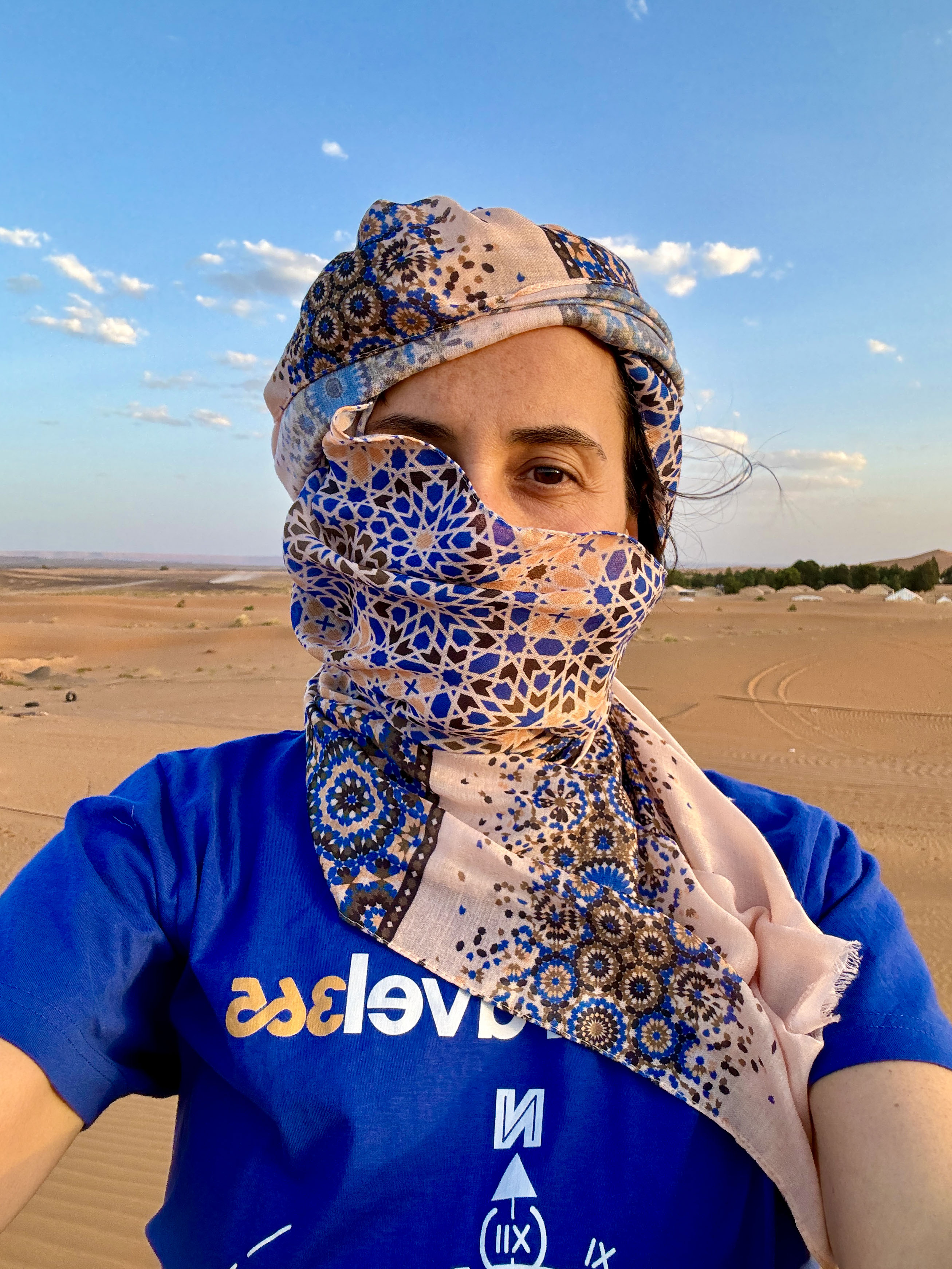 Una volta arrivata al camp, mi sono tolta le scarpe… e credo di aver svuotato mezza duna! Mi sono rilassata sorseggiando un tè alla menta, provando anche io a versarlo sollevando la teiera in alto per creare la famosa schiumetta. Poi è arrivato il momento di indossare la kefiah e lanciarmi nel sandboarding… con risultati decisamente discutibili (l’attività era gratuita al nostro camp)!