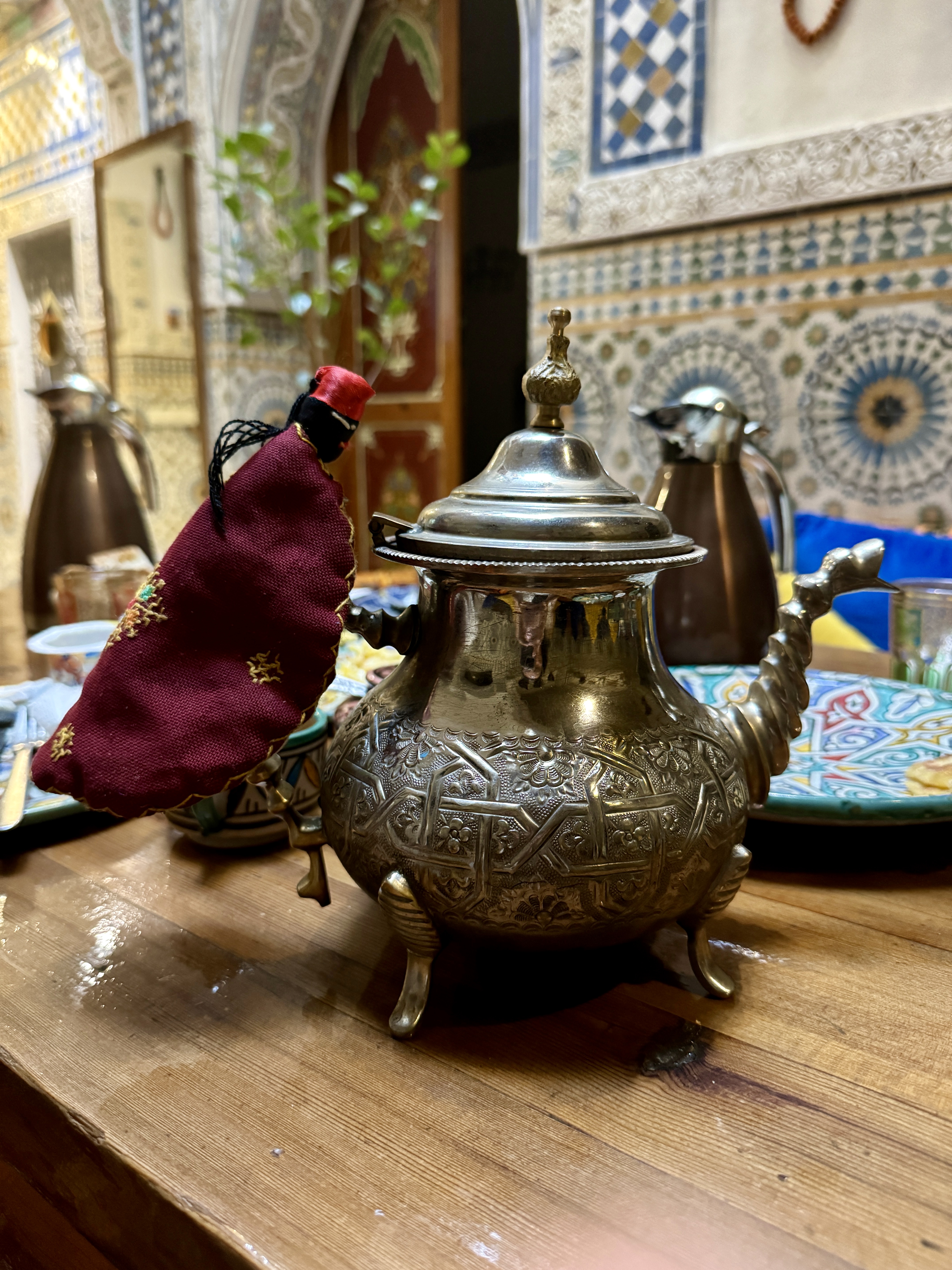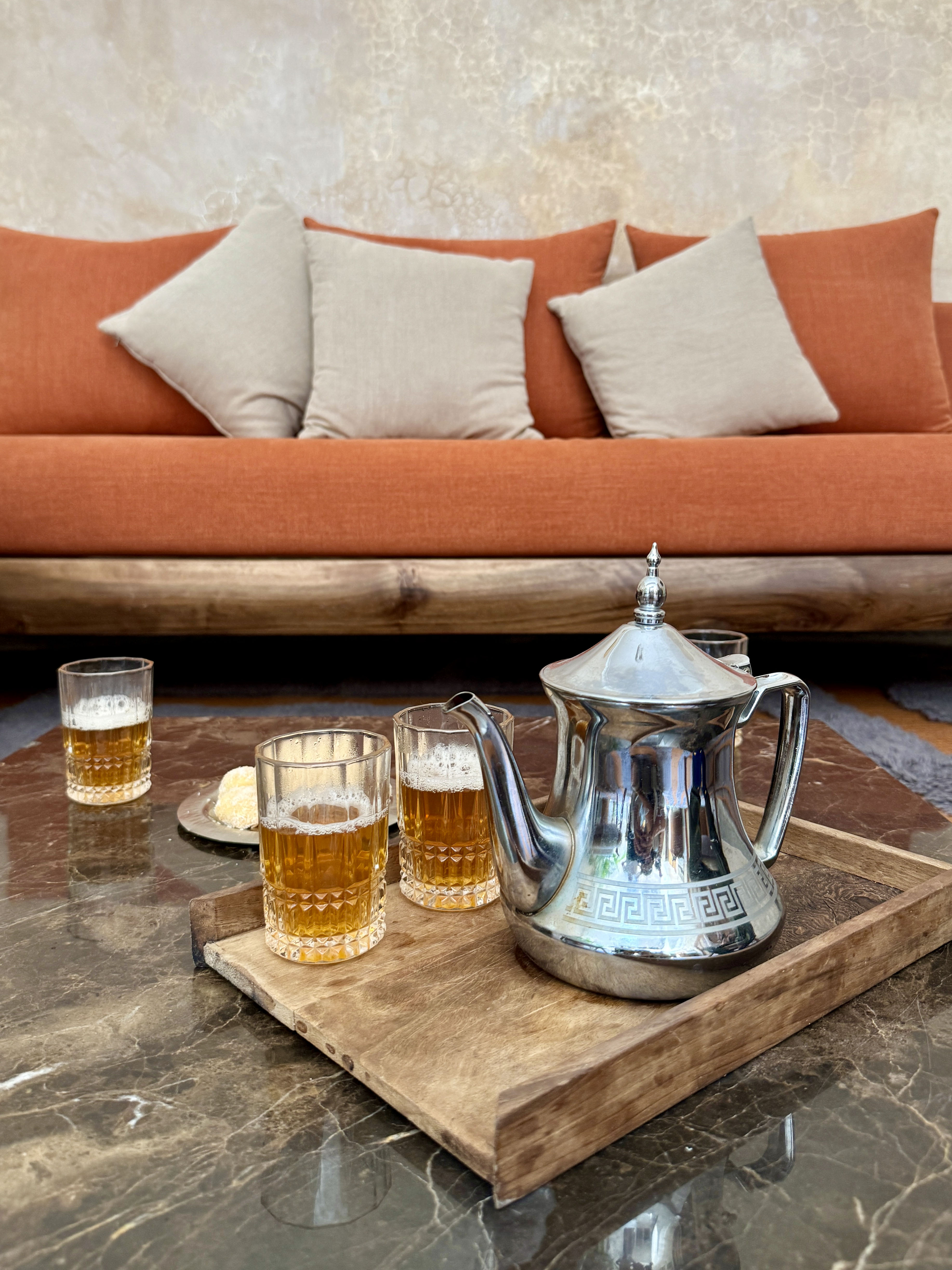 Ed è qui che ho capito che le colazioni in Marocco sono una cosa seria: msemen (pane sfogliato), marmellate e amlou (una crema spalmabile a base di mandorle, miele e olio d’argan), pane fresco, olive deliziose, crêpes, yogurt, uova – in questo caso strapazzate – con una delicata spolverata di cannella, caffè e l’immancabile tè alla menta.